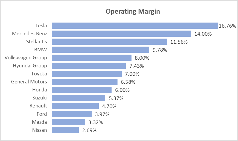 If we go by operating net profit margin instead, Tesla still dominated the industry, trailed closely by Mercedes-Benz. Stellantis beat BMW for third place and is the only full-line automaker to have a double-digit return.